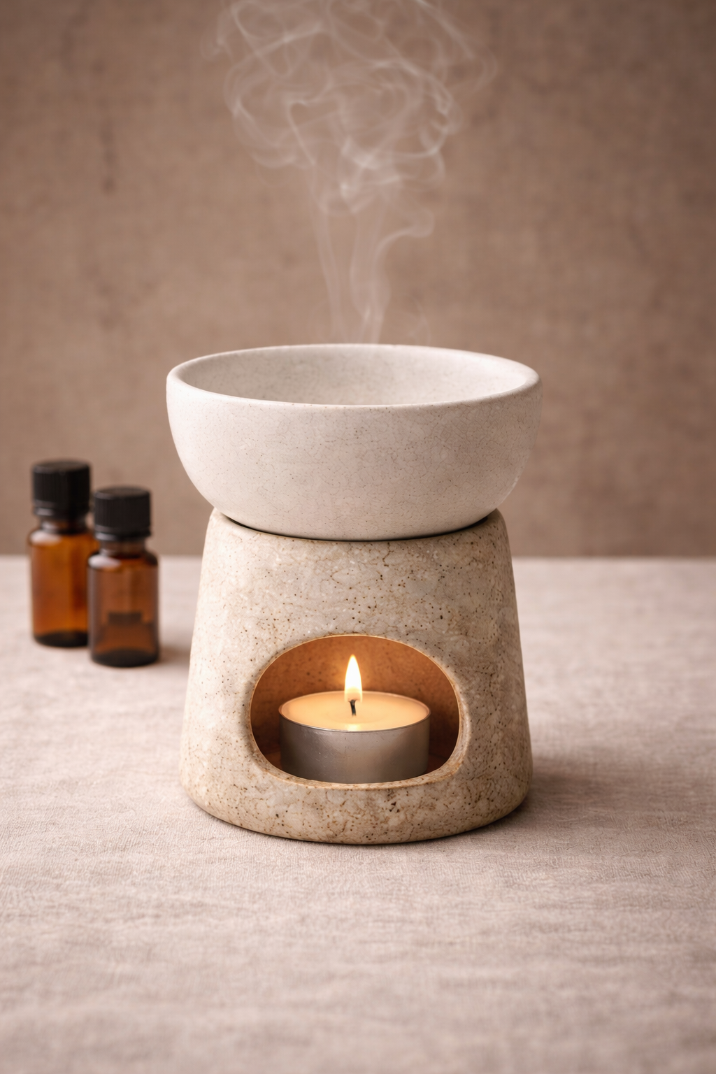 Difusor artesanal de cerámica hecho a mano, diseñado para esparcir fragancias naturales en espacios pequeños o medianos. La base de cerámica esmaltada presenta texturas suaves y un acabado sobrio que se integra en cualquier ambiente. Ideal para aromaterapia o como decoración funcional, este difusor equilibra forma y función con sensibilidad estética.