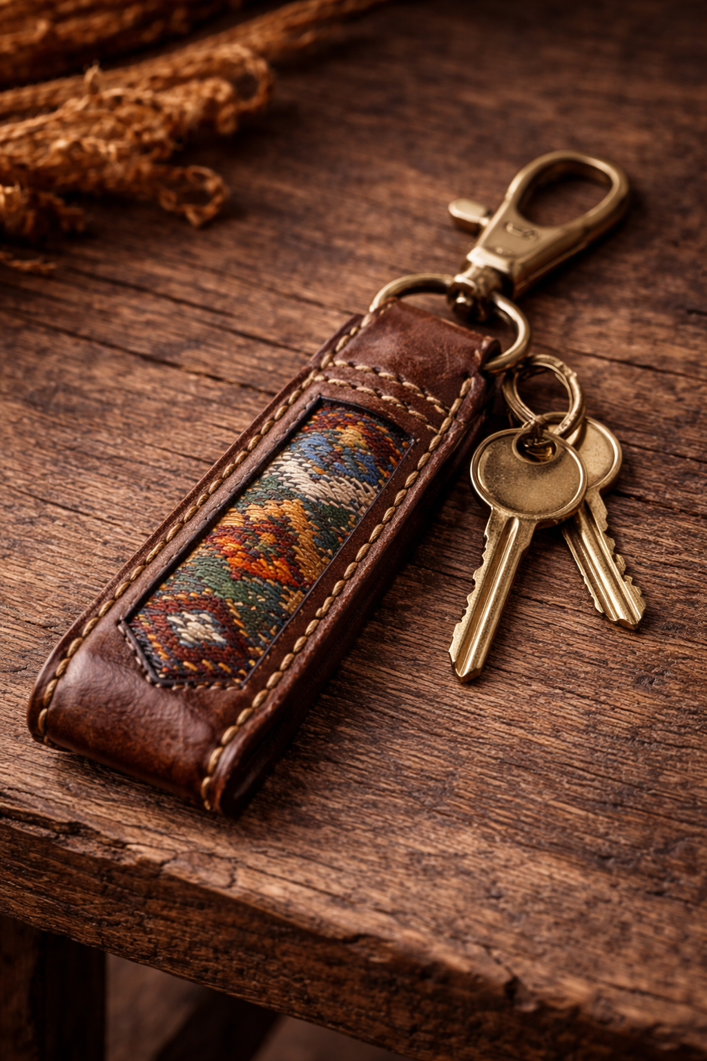 Llavero hecho a mano con cuero natural y detalles incrustados de materiales tradicionales. Cada pieza combina diseño refinado y resistencia, ideal como accesorio elegante y funcional para llaves o bolsos. Su acabado artesanal refleja cuidado en cada costura y textura única.